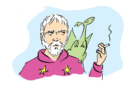 Max needs a light. He holds the cigarette in his mouth, pokes it out at an angle, and then carefully tips his head down to me.